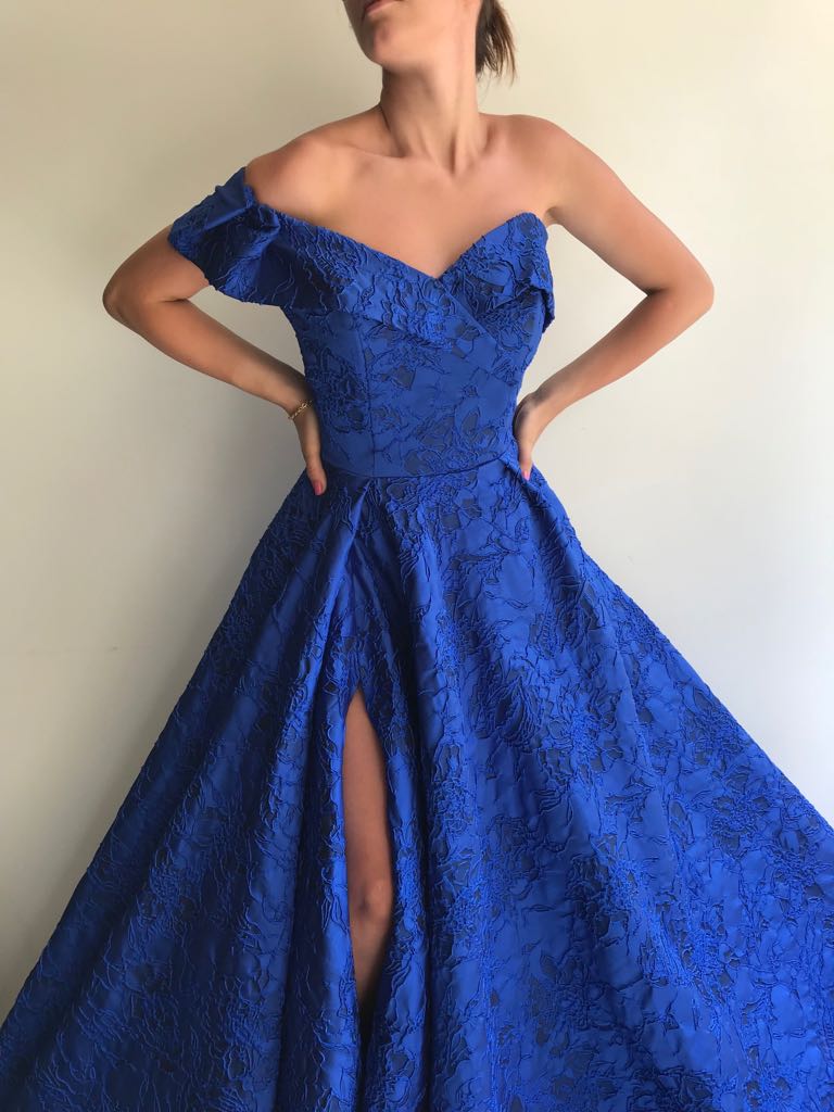 The off-shoulder blue gown is stylish and slightly flirtatious at the same time. It reveals the collarbones and leaves the overall look graceful. The blue color of sapphire makes this style seem very luxurious.